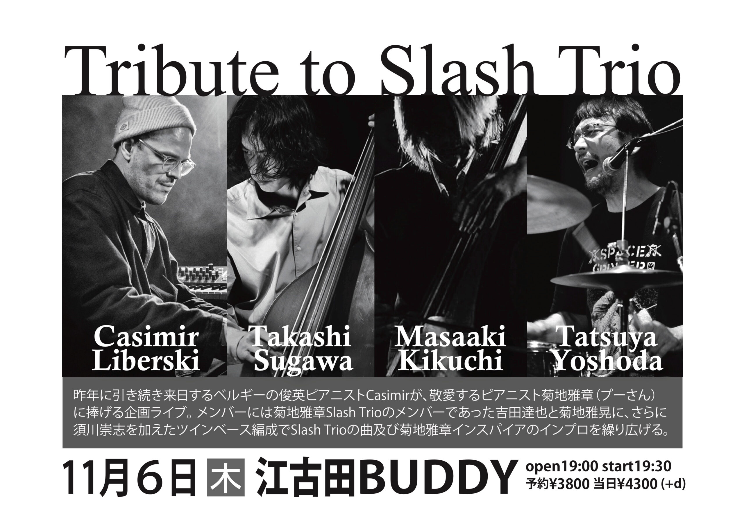 Tribute to Slash Trio 11月 6 Thu 2025 ジャズ 昨年に引き続き来日して吉田達也とデュオツアーを行うベルギーの俊英ピアニストCasimirが、敬愛するピアニスト菊地雅章(プーさん)に捧げる企画ライブ。メンバーには菊地雅章Slash Trioのメンバーであった吉田達也と菊池雅晃に、さらに須川崇史を加えたツインベース編成でSlash Trioの曲及び菊地雅章インスパイアのインプロを繰り広げる。 ■出演 Casimir Liberski : piano 吉田達也:drums, voice 菊地雅晃:contra bass, modular 須川崇志:contra bass, cello ■Doors open times OPEN 19:00 / START 19:30 ■Live charge 予約¥3,800+1ドリンク¥700 当日¥4,300+1ドリンク¥700 予約フォーム 前のスケジュール 次のスケジュール