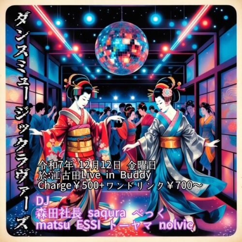 BAR TIME〜DJ Music Lounge〜 『DANCE MUSIC LOVERS』 12月 12 Fri 2025 DJミュージック ■music selector 森田社長 トーヤマ nolvic matsu ESSI saqura Beck ■Doors open times OPEN/START 20:00 ■charge ¥500+1drink¥700 前のスケジュール 次のスケジュール