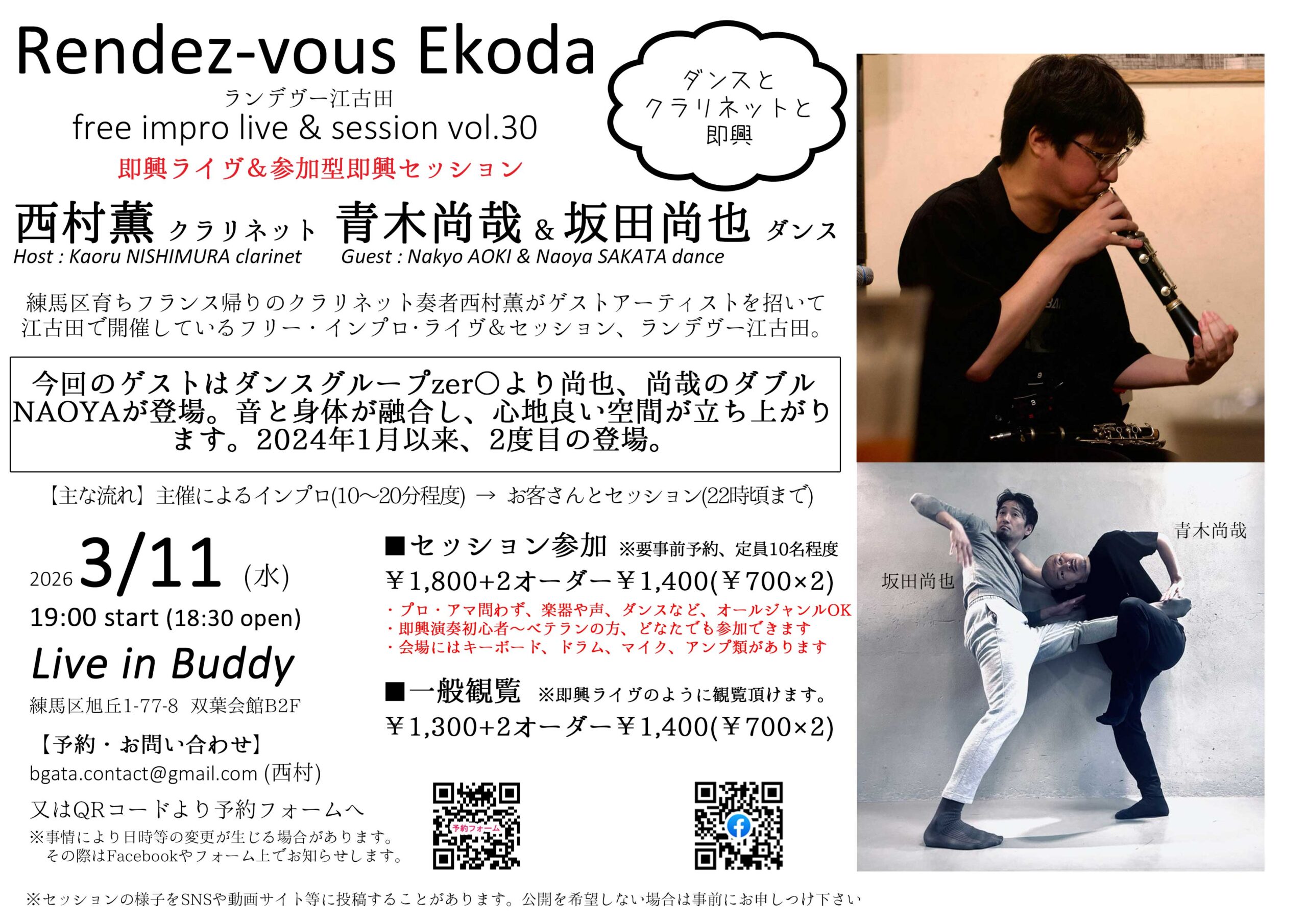 練馬区育ちフランス帰りのクラリネット奏者、西村薫がゲストアーティストを招いて江古田で開催するフリー・インプロ・ライヴ&セッション、ランデヴー江古田。 今回のゲストはダンスグループzer◯より尚也、尚哉のダブルNAOYAが登場。音と身体が融合し、心地よい空間が立ち上がります。