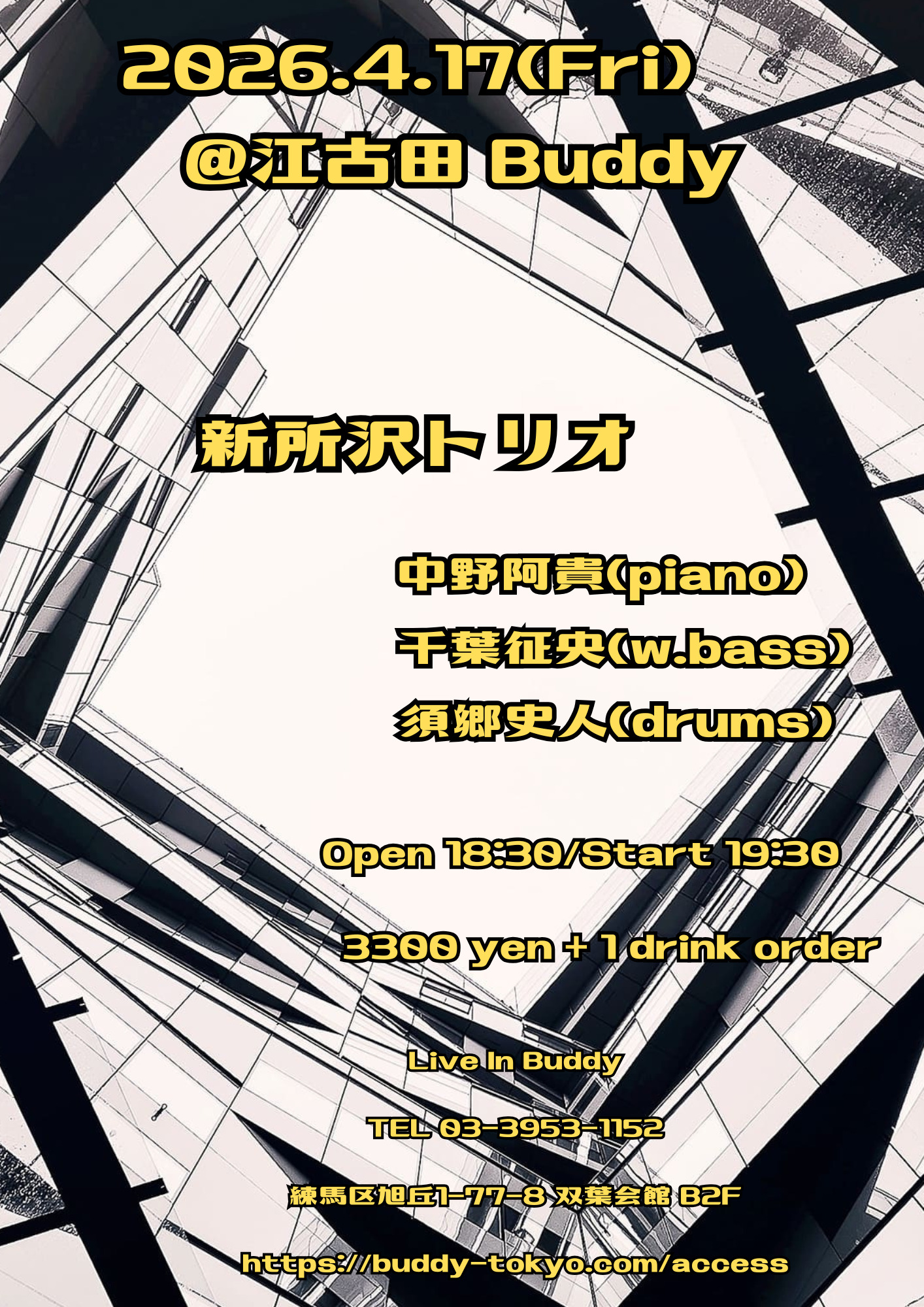 新所沢トリオ 4月 17 Fri 2026 ジャズ 江古田バディーに初登場のトリオです! 初共演となるメンバーが、スタンダードジャズを中心にお届けします♪ ■出演 中野阿貴(piano) 千葉征央(w.bass) 須郷史人(drums) ■Doors open times OPEN 18:30 / START 19:30 ■Live charge ¥3,300+1ドリンク¥700 予約フォーム 前のスケジュール 次のスケジュール