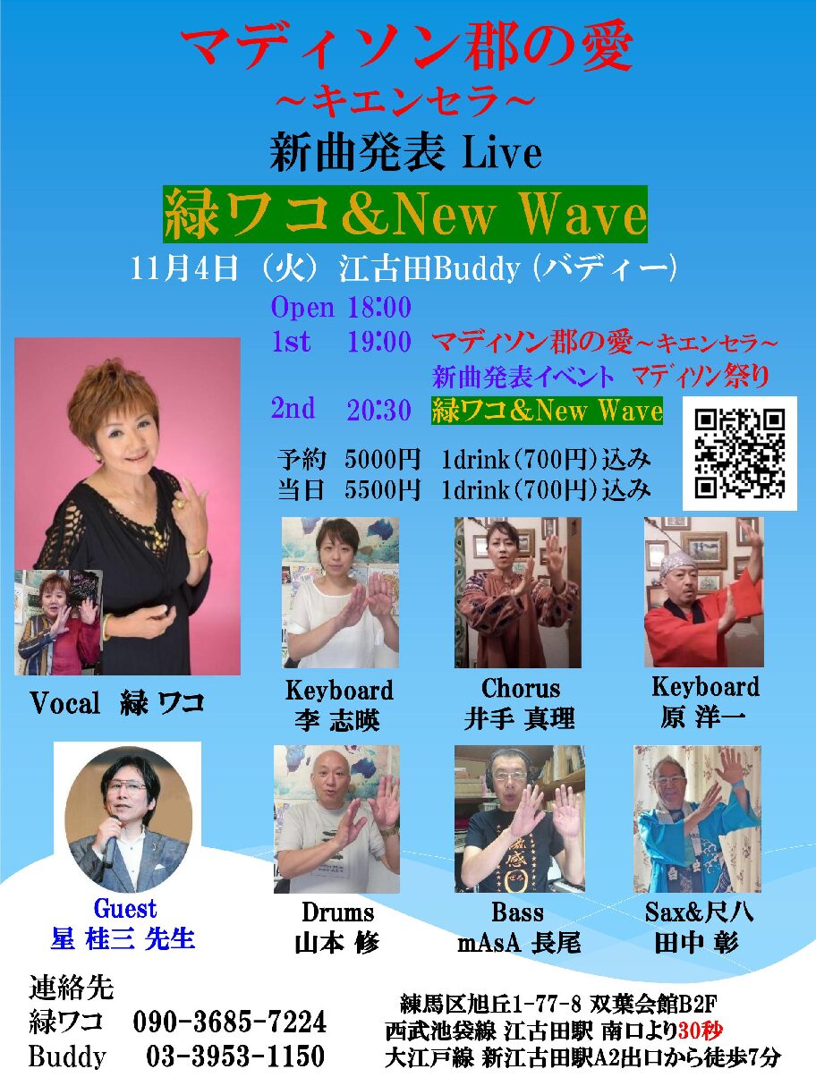 ■出演Vocal 緑ワコSax &尺八 田中彰Cho 井手真理Keyboard 原洋一K…